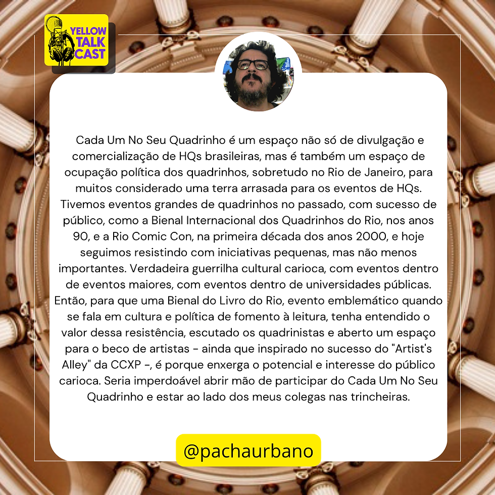 "Não existe eventos de quadrinhos no RJ".Bom, há alguns anos atrás, isso poderia ser verdade, mas não mais. Mesmo o Rio de Janeiro ter abrigado eventos importantes como a Bienal Internacional de Quadrinhos, essa memória se foi, todavia, está sendo resgatada pelas mãos do querido Lencinho, o idealizador do "Cada um no seu Quadrinho".